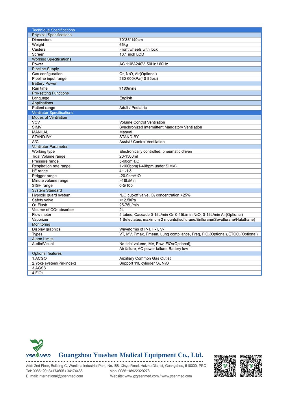 Respiration rate range: 1-100bpm(1-40bpm under SIMV)