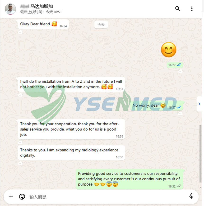 Medical professionals praise YSENMED's YSX500D 50kW 630mA Medical Digital X-ray System for its high-quality imaging and user-friendly design. Customer Abel highlights its impact, saying, "Thanks to you, I am expanding my radiology experience digitally," while commending YSENMED's exceptional after-sales service.