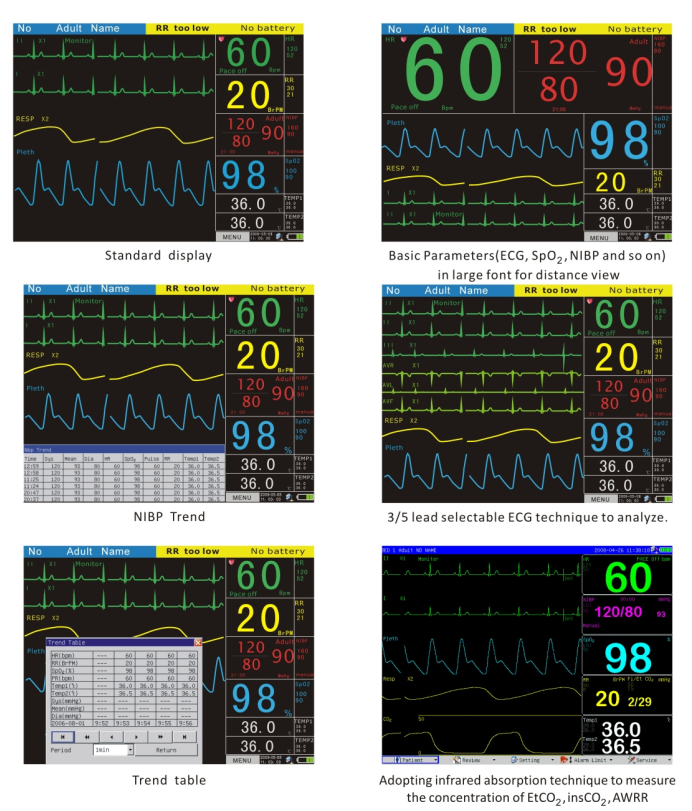 | Display mode | Standard, large font, NIBP trend, trend table, full lead ECG, Oxy CRG. | |||