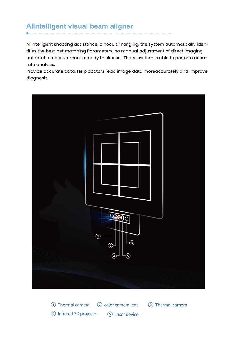 Al intelligent shooting assistance, binocular ranging, the system automatically identifies the best pet matching Parameters, no manual adjustment of direct imaging, automatic measurement of body thickness. The Al system is able to perform accurate analysis.