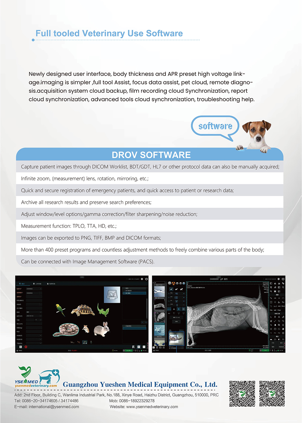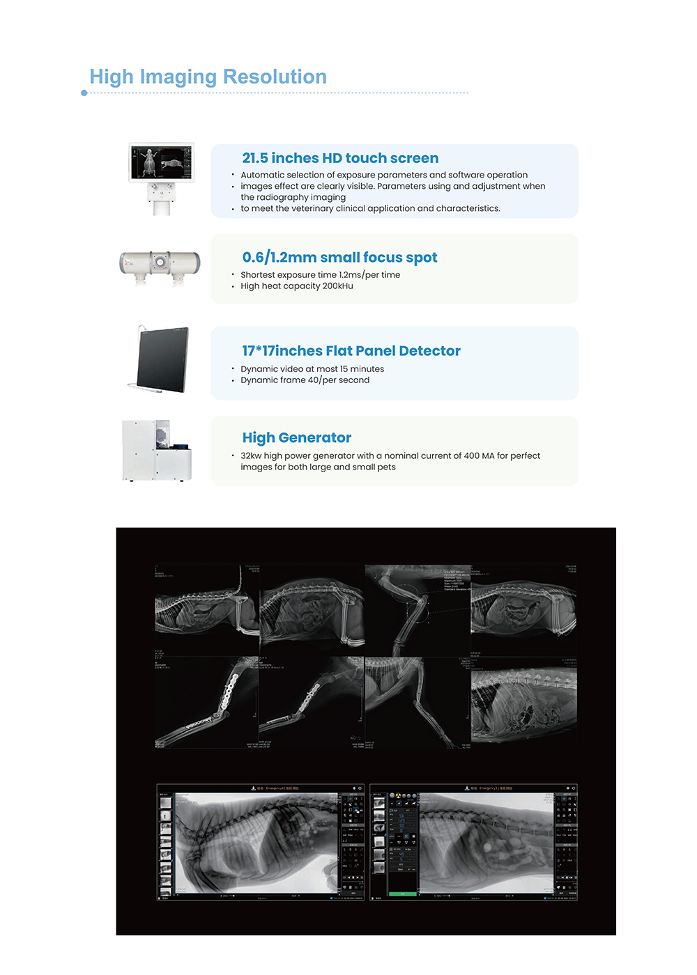 Automatic selection of exposure parameters and software operation images effect are clearly visible. Parameters using and adjustment when the radiography imaging to meet the veterinary clinical application and characteristics.
