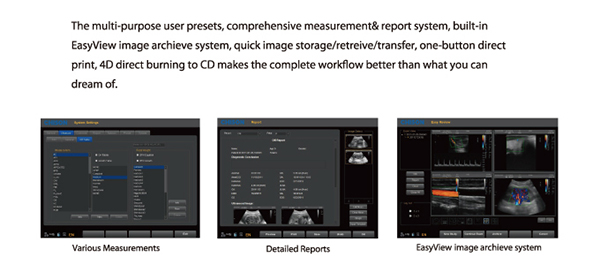 A work-flow oriented User Interface is built to allow user-friendly operation with minimum soft key entries. Ergonomical design of keyboard, 15 inch LCD large display, double probe connectors, USB and DICOM connectivity make your scan FAST and EASY, and allow you to focus more on your patients.