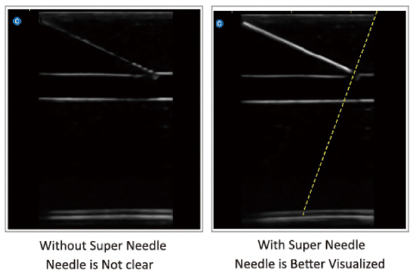 With Super Needle, clinicians can see needle inside tissue more clearly during medical procedures.Needle angle up to ±30°
