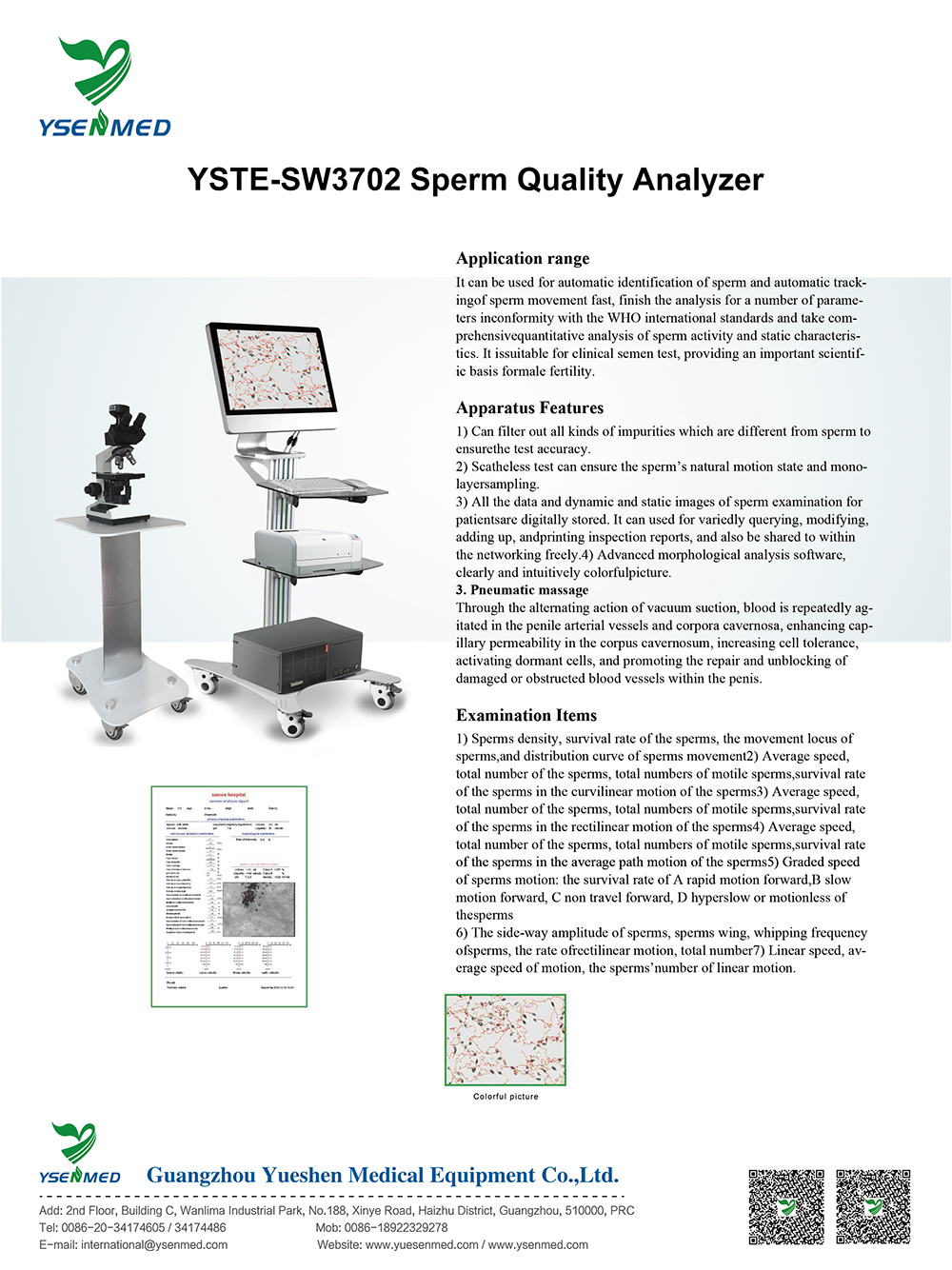 8) Displayed content of sperm test system is no less than: 1) distribution curve of static sperms, 2) the features data of semen and statistical data from analysis of all the main functions, 3) sperm dynamic trajectory curve, 4) display various sperms motion speed and energy is arrhythmic map of sperms, 5) case information for management such as patients’ name;
