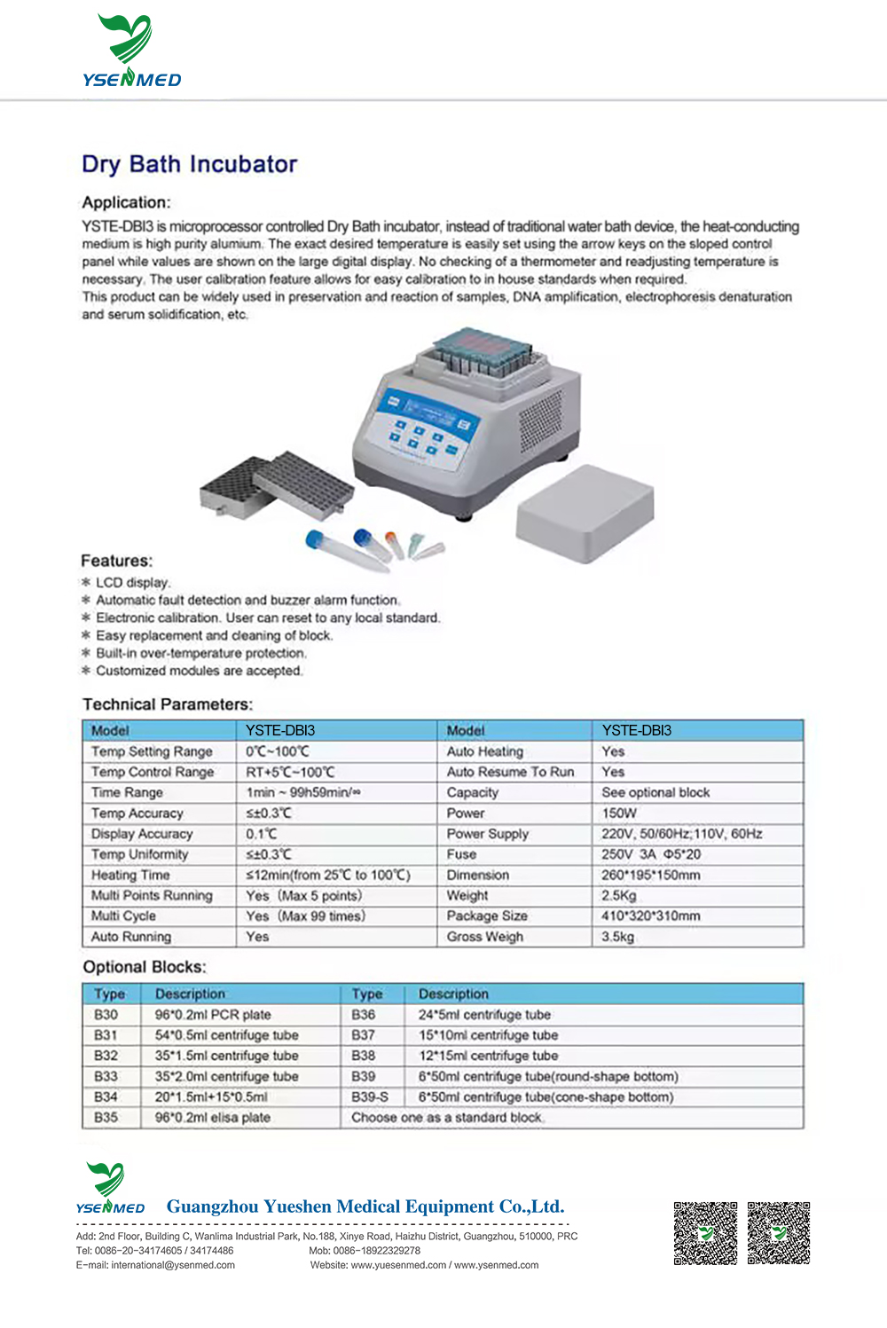 YSTE-DBI3 is microprocessor controlled Dry Bath Incubator. Instead of traditional water bath device, the heat-conducting medium is high purity alumium. The exact desired temperature is easily set using the arrow keys on the sloped control panel while values are shown on the large digital display. No checking of a thermometer and readjusting temperature is necessary. The user calibration feature allows for easy calibration to in house standards when required.