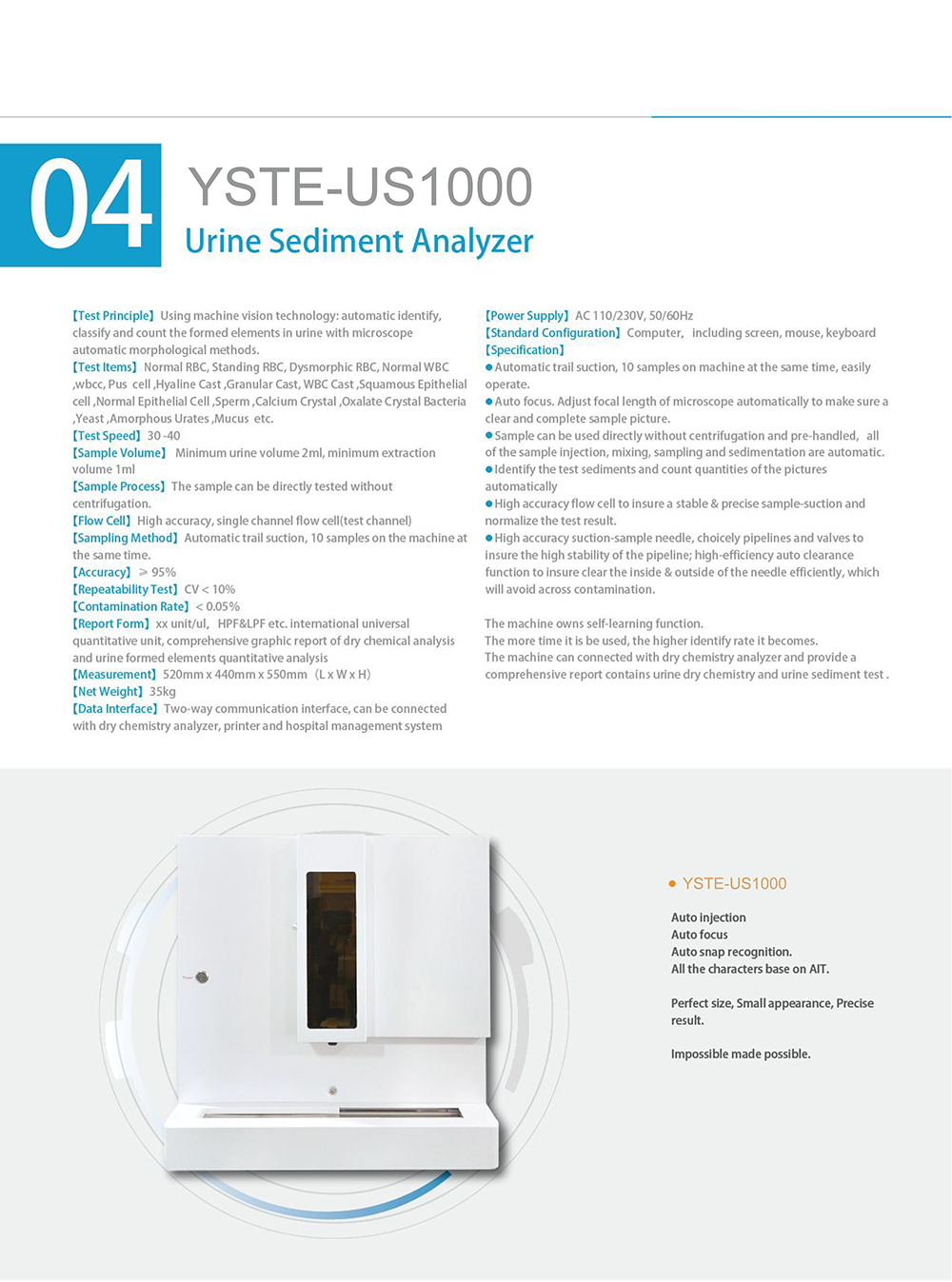 Fully automatic orbital injection, unmanned, with 10 samples on the machine simultaneously, easy to operate. Special focusing solution can be used to automatically correct the focal length of the microscope, ensuring clear and complete sample shooting. The specimen does not require centrifugation and preprocessing, and can be automatically injected, mixed, and taken
