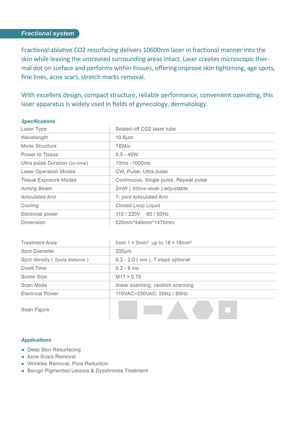 With Fractional scanner equipped, the device can be used in Dermatology and
