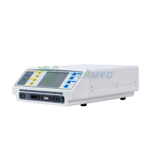 Main Features ★ Max 400W Electrosurgical Generator, with mono-polar and bipolar function. ★ Nine working modes: pure cut, blend1, blend2, blend3, contact coag, forced coag, soft coag, bipolar coag, bipolar cut. ★ Wide clinical applications, such as the general surgery, thoracic surgery, orthopedic surgery, cardiology, gynecology, urology(under water TUR), oncology, neurosurgery, etc. ★ Microprocessor controlled, LCD touch screen display. With audible and visual indicators and errors codes during the process of outputting. ★ Return Electrode Monitoring system and Power Peak System, minimizing the risk of tissue damage. ★ Both hand and foot controlled. ★ Separate power display and outlet socket for mono-polar cut, mono-polar coag, bipolar cut and bipolar coag, each output can be individually configured. ★ The unit always remember the last setting when it turned off. ★ Remote control function. The surgeon can adjust the outputs by power control ESU pencil. ★ The ESU unit can be connected with laparoscope and endoscope, etc. ★ Protection against over-voltage and over-current. ★ Defibrillation protected. ★ Convection refrigeration without ventilator. ★ Mounted on a 4 wheels cart(optional). ★ Meets the requirements of international safety standards EN60601-1 and EN60601-2. Technical Specifications Power: 220V±22V, 50Hz±1Hz(110V±11V, 60Hz) Operating frequency: a)Monopolar:512KHz b) Bipolar:1024KHz Power rating: 1100VA±10%