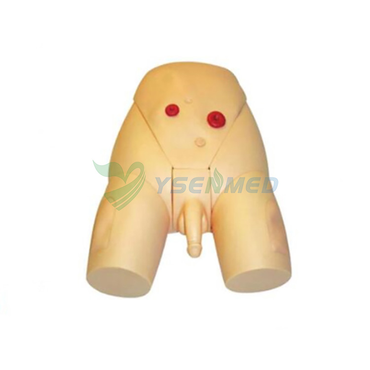 Features 1. Supine body position, legs buckling, hip joint abduction, and accurate surface marks. 2. General urethral catheterization process can be operated. 3. There are resistance when advance the catheter through mucosal fold, bulb of urethra and intraurethral sphincter. The penis the abdominal wall may form an angle of 60-degree. 4. Male perineum has realistic texture and the material has tensile rate and high tear strength. 5. Used for catheterization and bladder washing operation. 6. When the catheter into the bladder, artificial urine flows out from the conduit