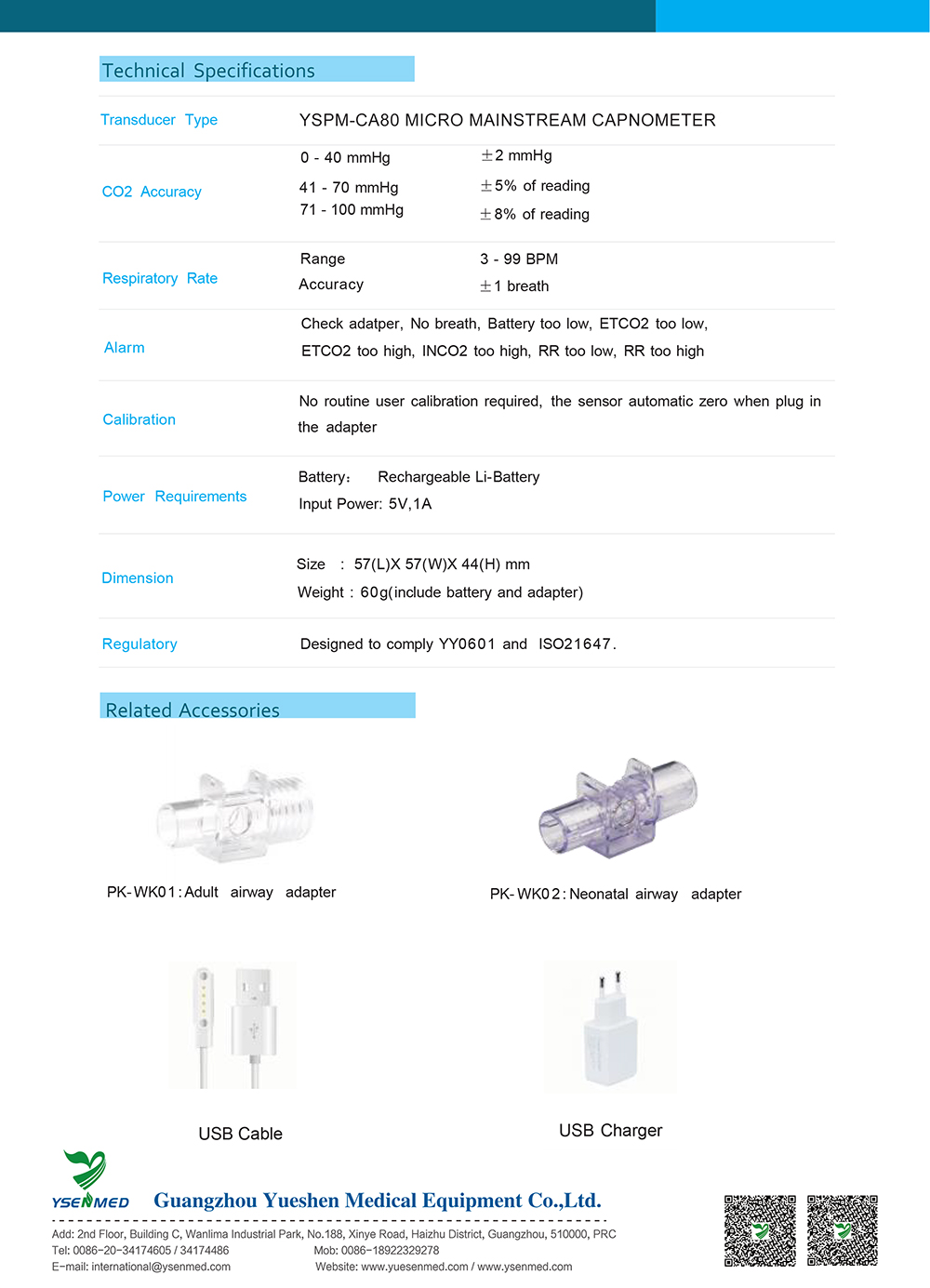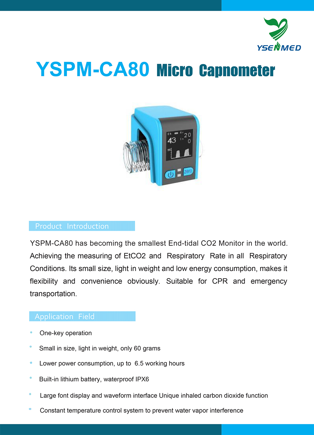 YSPM-CA80 has becoming the smallest End-tidal CO2 Monitor in the world, Achieving the measuring of EtCO2 and Respiratory Rate in all Respiratory