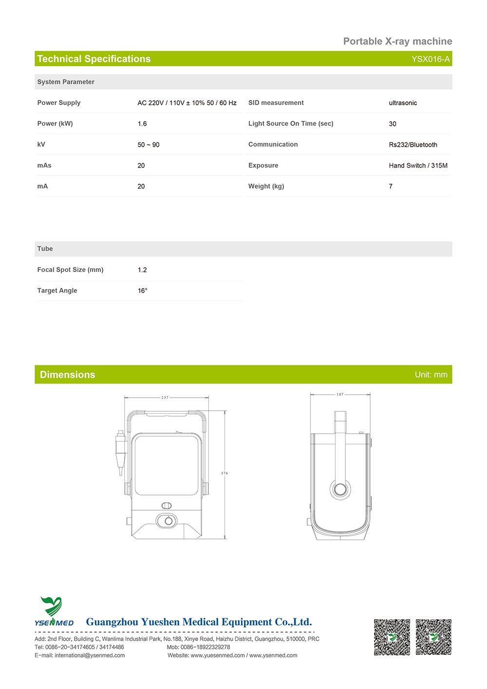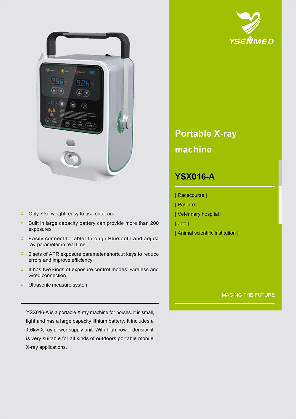 YSX016-A is a portable X-ray machine for horses. It is small, light and has a large capacity lithium battery. It includes a 1.6kw X-ray power supply unit. With high power density, it is very suitable for all kinds of outdoors portable mobile X-ray applications.