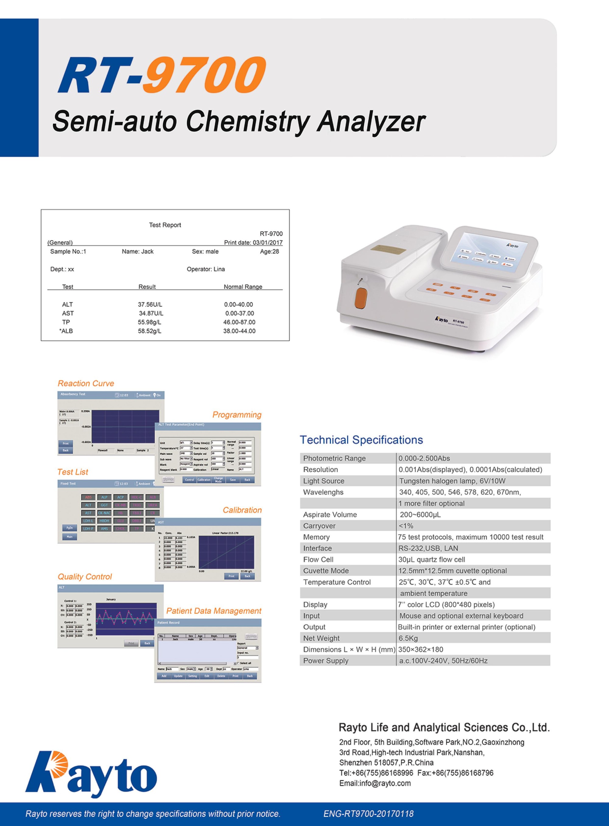 Analytical modes include kinetic, fixed time, bicromatic end-point with or without reagent blank or sample blank, linear or non-linear calibration