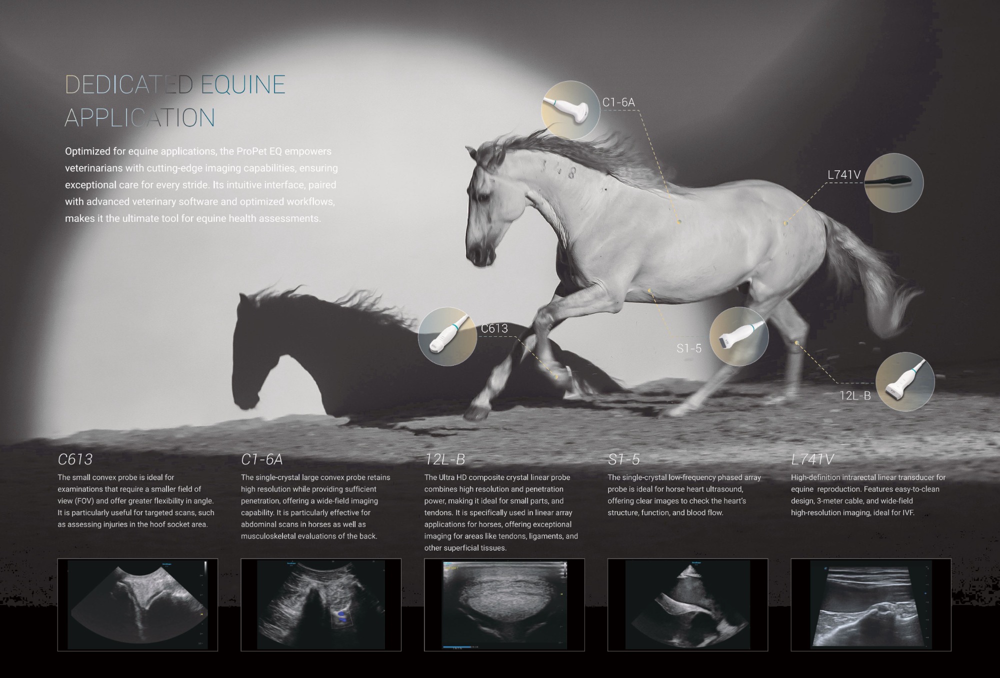 The ProPet EQ Ultrasound is specifically designed for equine diagnostics, featuring dedicated applications and professional presets for a range of clinical scenarios, including MSK, ABD, Cardiac, and REPRO.