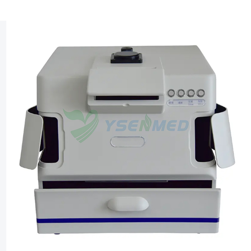 YSTE-UVT03A is strong and compact with a viewing window. The glass plate of the viewing window is ultra-violet ray intercepting glass, it can protect your eyes. On the top of the apparatus, there is a cylinder for the connector and the filter that are for the digital camera to take the photos. There are some holes in the bottom of the apparatus, which are used for heat elimination. At both top sideling sides of the viewing cabinet, there are built-in light tubes and UV reflected light tubes. The UV reflected light tubes allow you to project either longwave UV at 365nm or shortwave UV at 254nm depending on your needs. It has a dark room and it is designed to minimize UV radiation hazards to the user, it can be used in a daylight room. The application of the electronic ballast in the apparatus makes the apparatus light. The lighting tube will start immediately when you turn on the main power switch without any stroboscopic phenomenon.