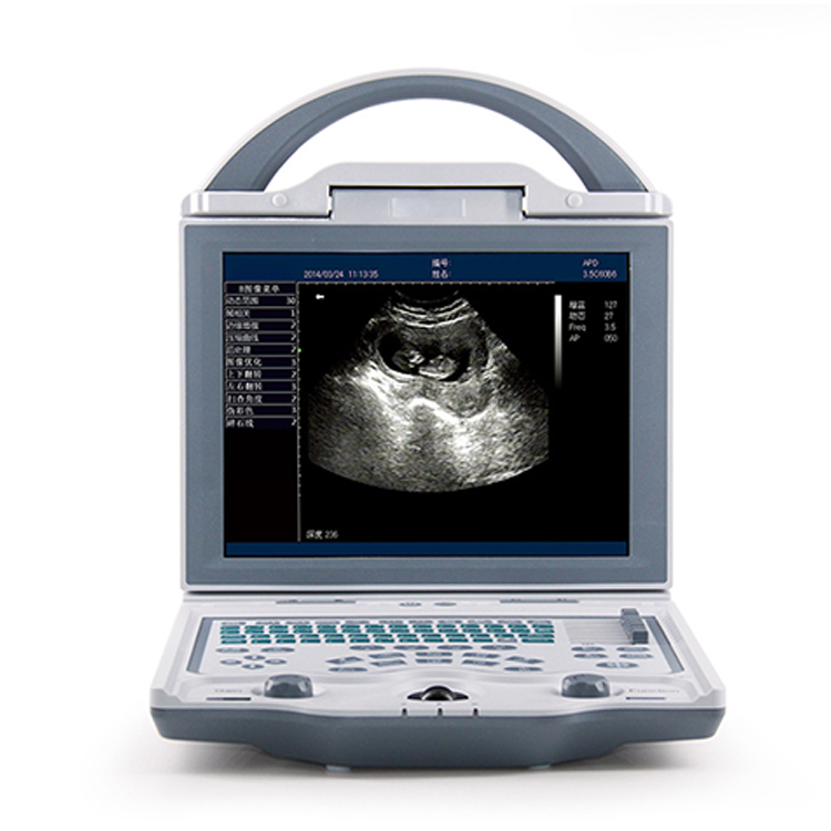 10.4' high resolution color LED backlight display, with high contrast and wide viewing angle Adopt ARM7 embedded control system +FPGA signal processing system + well selected ultrasound hardware system, all make the unit more stable Menu operation system, with different languages according to requirement including Spanish, English, French, Russian and Portuguese Two probe sockets, auto-identify different optional probe Body marks:total 64 kinds body marks indicating probe position Display mode:B,2B,4B ,B/M,M Adjustable depth: 10 grades, max depth to 236mm Contrast:27~90dB Gray scale:256 8 steps intelligent TGC Frame frequency: 30 frames /second 8 kinds pseudo colors Image storage: 4G hard disk to permanently store about 5000 frames images;without loss when power off Cine loop:256 frames Puncture guide function with 2 correctable puncture guiding lines(adjustable angle & position) The gravel software package with real-time position line measurement Normal measurement: distance,perimeter, area, volume, angle, length and area stenosis ratio measurement OB measurement including: 15 kind of obstetric software, several GA measurement, amniotic fluid index ,fetal growth curve and OB report Urology measurement and analysis: residual urine volumem, prostate volume, and urology report Dual TV output: PAL/NTSC, can connect video printer when necessary Power supply:100-240V~ 1.2-0.6A frequency:50-60Hz Power supply adaptor output:DC12.8V 3.0A Main unit weight:4.5kg(without accessories) Main unit dimension:256×150×326mm(L×W×H) Main basic configuration: 1. Main unit 2. 3.5MHz convex probe Optional parts: 1. 6.5MHz multi-frequency trans-vaginal probe 2. 7.5MHz multi-frequency linear probe 3. Li-battery 4. Trolley 5. Charger