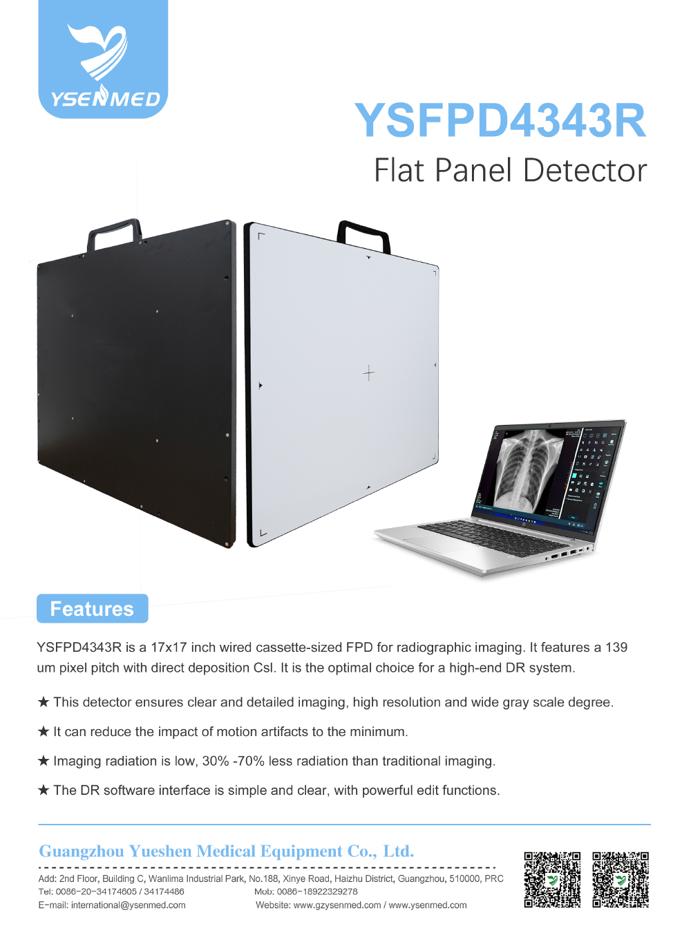 YSFPD4343R is a 17x17 inch wired cassette-sized FPD for radiographic imaging. It features a 139um pixel pitch with direct deposition Csl. It is the optimal choice for a high-end DR system.