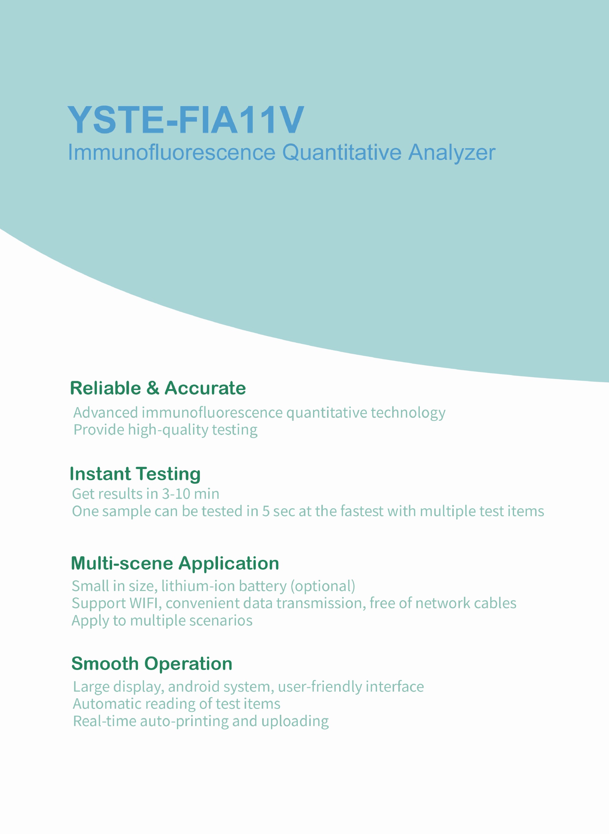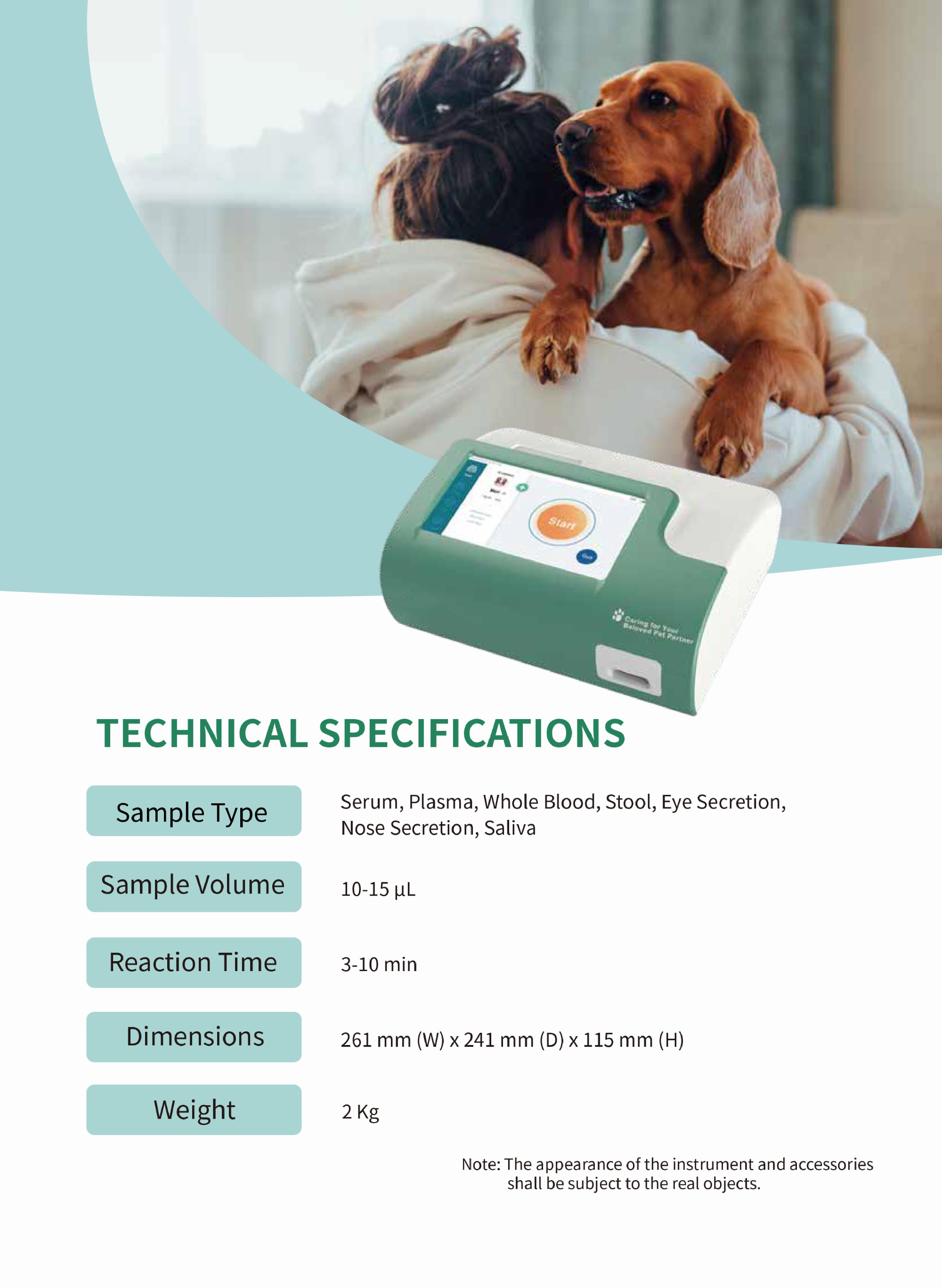 YSTE-FIA11V lmmunofluorescence Quantitative Analyzer (hereinafter called Getein 1100 Vet) aids in the detection for cardiac, inflammation, parasite prevention, infectious disease, etc. in canines and felines by analyzing serum, plasma, whole blood, stool, eye secretion, nose secretion and saliva from pets.