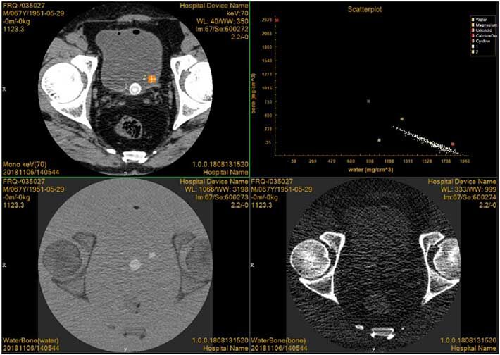Case presentation: This patient was a 67-year-old man with many years of bladder calculi. Image showed two large (1) small (2) stones in the bladder, and the main components of the stones were determined as uric acid by scatter plot. At the same time, calculi were found in the water diagram but not in the bone diagram, which was also consistent with the characteristics of uric acid calculi.