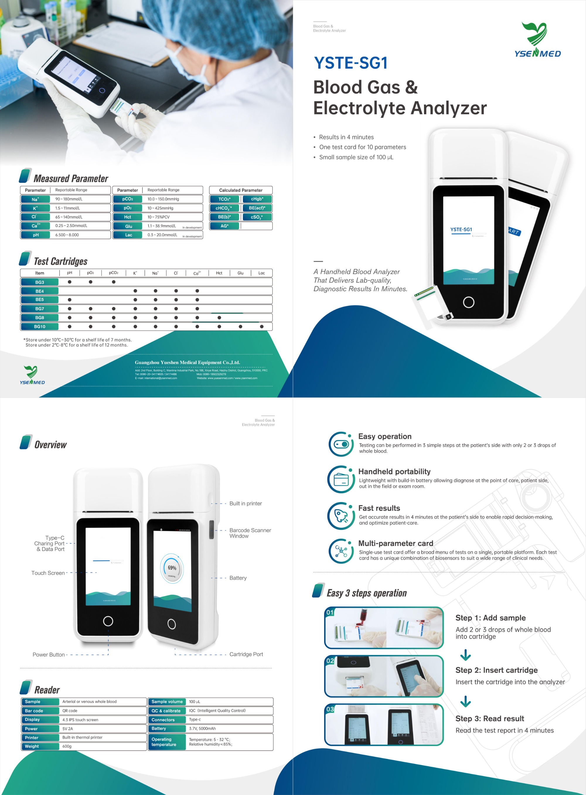 YSTE-SG1 is a blood gas and electrolyte analyzer for critical care that combines microfluidic and micro biosensing technologies and enables blood gas electrolyte detection in a micro detection instrument. This is the first blood gas and electrolyte analyzer in China to realize hand-held blood gas and electrolyte detection.